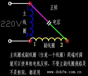 其實是這樣,主線圈的1(2)接副線圈的2(1),這樣就正轉,反過來 主線圈的1(2)接副線圈的1(2),這樣就反轉, 以上兩個圖,一般的常規單相電機都可以用,不論他的主線圈與副線圈的參數一樣不一樣, 另外還有一種單相電機,工作中需要他正反轉,但是采用上面的辦法,比較麻煩,實現自動控制,器件需要也多,所以就出現了,不分主副線圈的單相電機,就是主副線圈的參數一樣,這種不分主副線圈的單相電機,除了用上面的這個辦法外還可以這樣