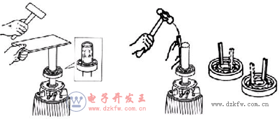 (d)后端蓋的裝配:將軸伸端朝下垂直放置,在其端面上墊上木板,后端蓋套在后軸承上,用木錘敲打,見圖3-1所示。把后端蓋敲進去后,裝軸承外蓋。緊固內外軸承蓋的螺栓時注意要對稱地逐步擰緊,不能先擰緊一個,再擰緊另一個。
