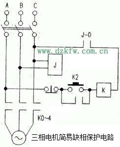 工作原理:臺上三相空氣開關,中間繼電器吸合。按下K2常開按鈕,K2自鎖,交流接觸器K合上如果A相因故障缺相,則K線圈失電,而交流接觸器K斷開。若B相或C相缺相,則中間繼電器J和交流接觸器K的線圈同日十失電,而J和K同時斷開,起雙重保護作用。 元件選擇 J為中間繼電器,K為交流接觸器,線圈電壓均為380V,交流接觸器大小由負載而定。