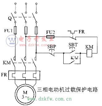 當電動機超載時,在一定的時間內及時切斷主電源電路實現過載保護,是制冷裝置中常采用的。圖5-12是采用熱繼電器的過載保護電路。