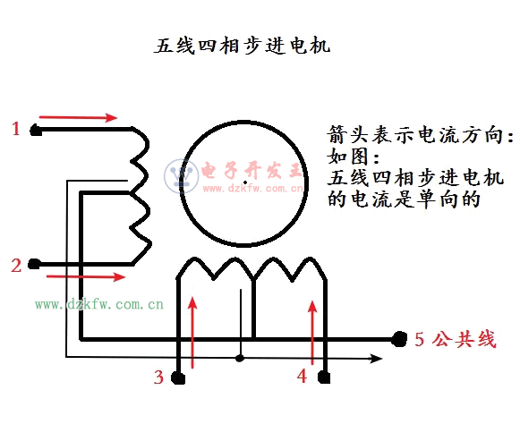 由于有五個接線頭,即接線頭的個數是奇數個,也就是說有一個接線頭是公共接頭,所以它的線圈的導電方式就只允許是 單向的 ,即這個步進電機是單極性的。如下圖: