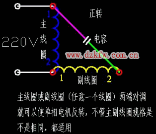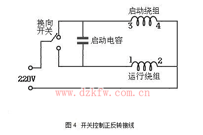 圖4是帶正反轉(zhuǎn)開關(guān)的接線圖,通常這種電機的起動繞組與運行繞組的電阻值是一樣的,就是說電機的起動繞組與運行繞組是線徑與線圈數(shù)完全一致的。一般洗衣機用得到這種電機。這種正反轉(zhuǎn)控制方法簡單,不用復雜的轉(zhuǎn)換開關(guān)。