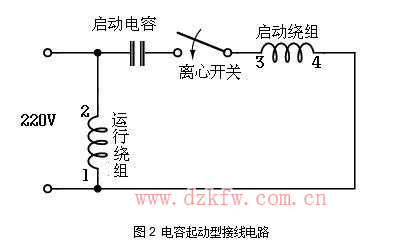 第二種,電機靜止時離心開關(guān)是接通的,給電后起動電容參與起動工作,當轉(zhuǎn)子轉(zhuǎn)速達到額定值的70%至80%時離心開關(guān)便會自動跳開,起動電容完成任務(wù),并被斷開。起動繞組不參與運行工作,而電動機以運行繞組線圈繼續(xù)動作,如圖2。