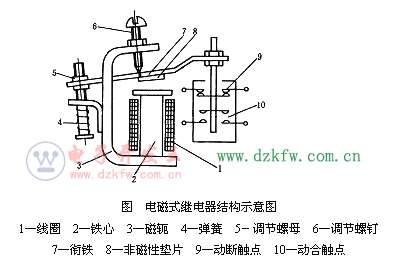 當通過電流線圈1的電流超過某一定值,電磁吸力大于反作用彈簧力,銜鐵 7 吸合并帶動絕緣支架動作,使動斷觸點 9 斷開,動合觸點 10 閉合。通過調節螺釘6 來調節反作用力的大小,即調節繼電器的動作參數值。
