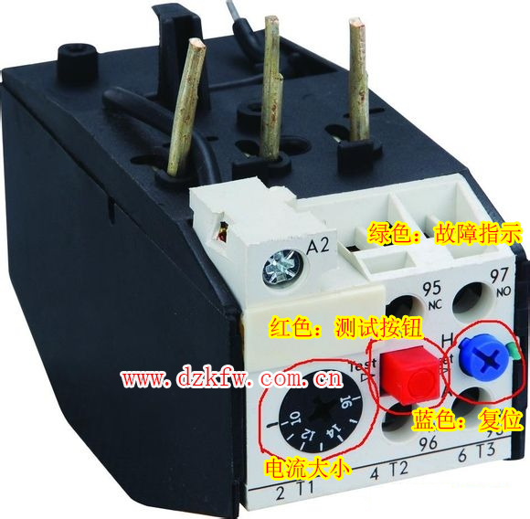 黑的調(diào)電流的,紅的測試,藍的是按下復(fù)位按鈕,藍色旁邊綠色那個凸出來是動作指示,藍色的上面十字長的指向H是手動復(fù)位,把它按下去往左旋到指向A是自動復(fù)位。 綠色的那個凸出是故障指示,凸起代表故障。