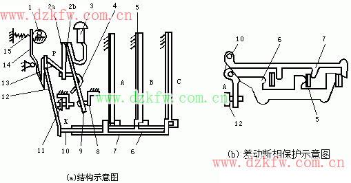 上圖 中:1——電流調節(jié)凸輪,2——片簧(2a,2b),3——手動復位按鈕,4——弓簧片,5——主金屬片,6——外導板,7——內導板,8——常閉靜觸點,9——動觸點,10——杠桿,11——常開靜觸點(復位調節(jié)螺釘),12——補償雙金屬片,13——推桿,14——連桿,15——壓簧