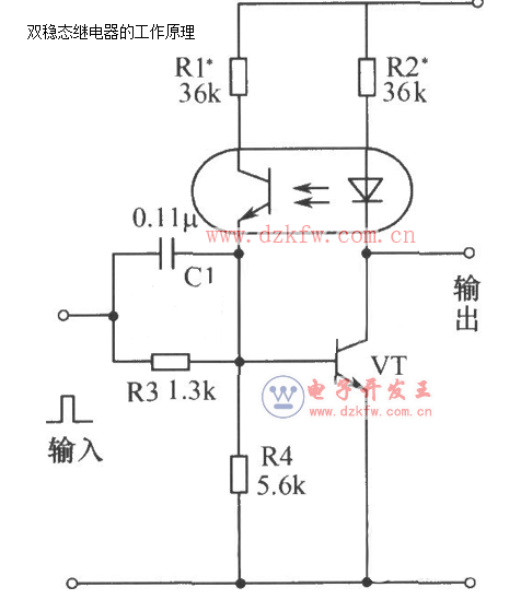 如圖所示為由光電耦合器和晶體管組成的雙穩態電路。在電源電壓接通瞬間的初始狀態,晶體管VT截止,該電路輸出高電位。當輸入端加上正脈沖時,使VT的集電極電流增加,光電耦合器發光二極管發光,光敏三極管的集射間電阻變小,結果使VT的基極電流增加,形成正反饋,使VT迅速達到飽和狀態,由“1”變成“0”。當輸入負脈沖后,使VT的集電極電流變小,發光二極管變暗進而使VT的基極電流變小,引起VT的集電極電流進一步減小,使VT迅速變成截止狀態,發光二極管不發光,光敏三極管截止,使VT穩定在截止狀態,觸發器由“0”變為“l”狀態。此雙穩態電路可以提高雙穩態電路的抗干擾能力。