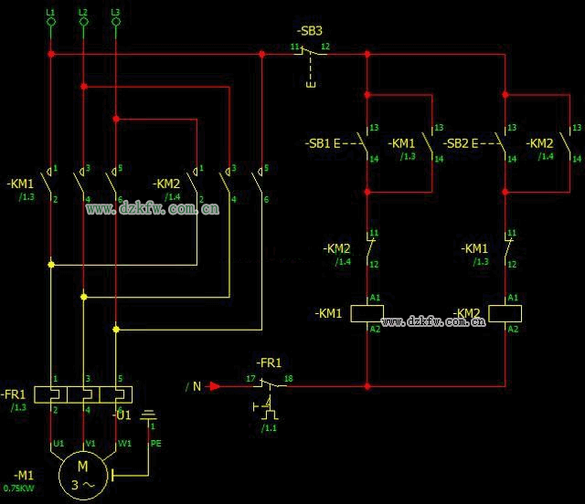 不同的繼電器所控制的負載類型是不一樣的,接觸器一般用于驅動三相負載如三相異步電機,像我們經常說的啟保停、正反轉、星三角啟動、延遲等控制都需要用到接觸器,因為它的主觸點有3組或者4組的,還附帶常閉和常開的輔助觸點。比如下面這種使用按鈕開關和接觸器、熱繼電器組成的正反轉控制電路,一個接觸器KM1控制電機正轉,另一個控制反轉,利用它的輔助觸點進行自鎖和互鎖。