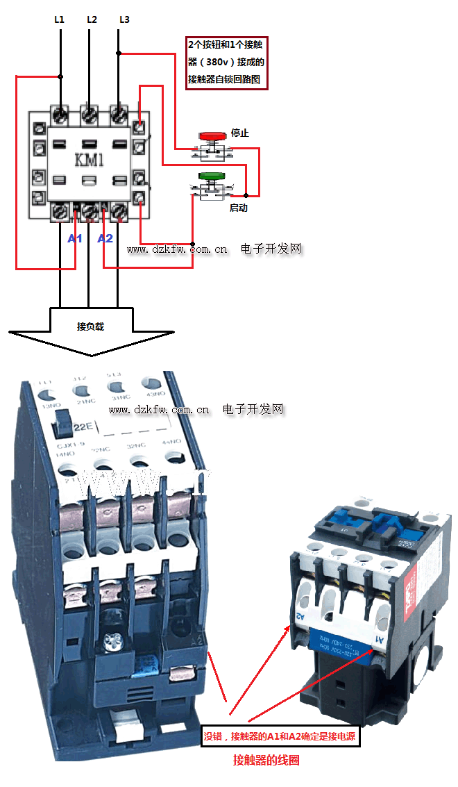 如果接觸器線圈是220v的:A1 接火 A2 接零 或A1 接零 A2 接火。