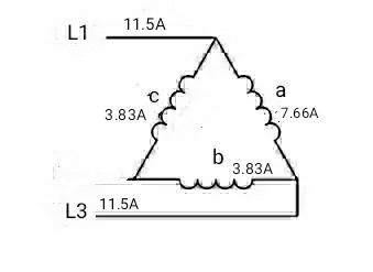 假設L2斷相,當L1、L3線電流達到10×1.15=11.5A時,熱繼電器應在2h(小討)內動作。這時a相電流為7.66A,b、c相電流為3.83A。這是因為在斷相狀態,b、c相串聯后再與a相并聯,b、c相的總阻抗是a相阻抗的2倍,因此a相電流是b、c相的2倍。