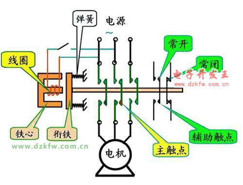 (4)輔助系統,主要包括復位彈簧,外殼,接線柱,支架和底座,復位彈簧作用是當線圈失電時推開(或拉回)銜鐵,使常開和常閉觸點復位,底座用于安裝交流接觸器。