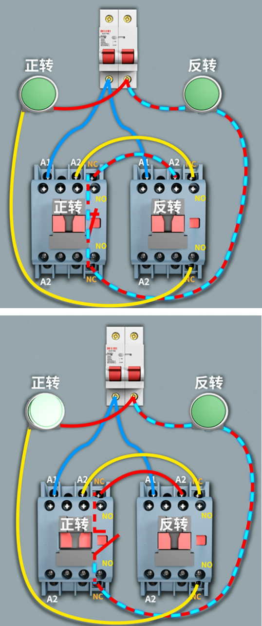 區別于自鎖時接觸器將自己鎖定在吸合狀態,互鎖是指幾個接觸器之間相互鎖定,只要其中一個接觸器吸合,其余接觸器將無法接通。