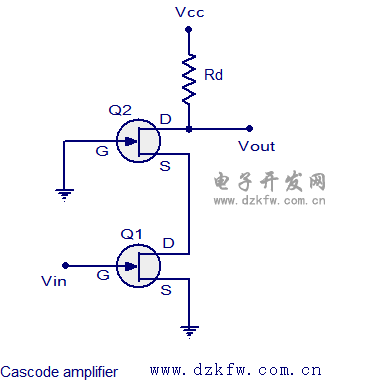 上面顯示了一個典型的共源共柵FET放大器的電路圖。電路的輸入級是FET的共源放大器和輸入電壓(Vin)應用于其門。輸出級是一個FET共柵放大器輸入級驅動。路是輸出級的漏極電阻。從Q2的漏極輸出電壓(Vout)。由于Q2的柵極接地,場效應管Q2的電壓源和場效應管Q1的漏極電壓幾乎不變。這意味著上FET Q2提供了一個較低的FET Q1的低輸入阻抗。這減少了較低的FET Q1的增益和米勒效應也因此被減少,這在增加帶寬的結果。在較低的FET Q1的增益減少不影響整體的增益,因為上部場效應管Q2的補償。上部FET Q2被米勒效應的影響,因為漏源的雜散電容的充電和放電通過漏極電阻和負載和頻率響應,如果只為高頻率的影響(遠遠超過音頻范圍內) 。