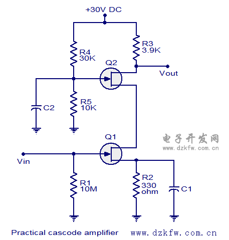 一個實用的級聯放大器電路的基礎上場效應管上面顯示。場效應管Q2的電阻R4和R5組成一個分壓器偏置網絡。R3是Q2的漏電阻和漏電流限制。R2是Q1的源電阻和C1是由通電容。R1確保在Q1的柵極在零電壓零信號條件。