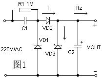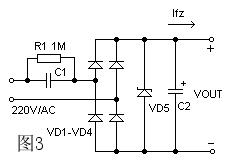 電容降壓式簡易電源的基本電路如圖1 ,C1 為降壓電容器,D2 為半波整流二極管,D1 在市電的負半周時給C1 提供放電回路,D3 是穩壓二極管,R1 為關斷電源后 C1 的電荷泄放電阻。在實際應用時常常采用的是圖2 的所示的電路。當需要向負載提供較大的電流時,可采用圖3 所示的橋式整流電路。