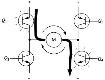 要使電機運轉(zhuǎn),必須使對角線上的一對三極管導(dǎo)通。例如,如圖4.13所示,當(dāng)Q1管和Q4管導(dǎo)通時,電流就從電源正極經(jīng)Q1從左至右穿過電機,然后再經(jīng)Q4回到電源負(fù)極。按圖中電流箭頭所示,該流向的電流將驅(qū)動電機順時針轉(zhuǎn)動。當(dāng)三極管Q1和Q4導(dǎo)通時,電流將從左至右流過電機,從而驅(qū)動電機按特定方向轉(zhuǎn)動(電機周圍的箭頭指示為順時針方向)。