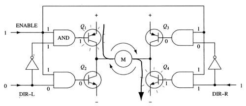 采用以上方法,電機的運轉(zhuǎn)就只需要用三個信號控制:兩個方向信號和一個使能信號。如果DIR-L信號為0,DIR-R信號為1,并且使能信號是1,那么三極管Q1和Q4導(dǎo)通,電流從左至右流經(jīng)電機(如圖4.16所示);如果DIR-L信號變?yōu)?,而DIR-R信號變?yōu)?,那么Q2和Q3將導(dǎo)通,電流則反向流過電機。