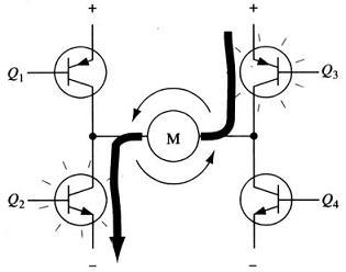 圖4.14所示為另一對三極管Q2和Q3導(dǎo)通的情況,電流將從右至左流過電機。當(dāng)三極管Q2和Q3導(dǎo)通時,電流將從右至左流過電機,從而驅(qū)動電機沿另一方向轉(zhuǎn)動(電機周圍的箭頭表示為逆時針方向)。