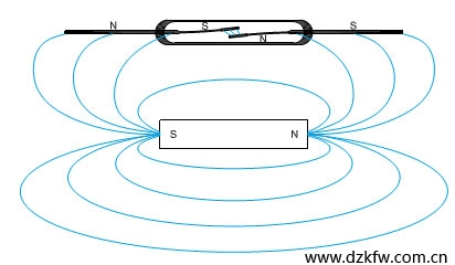 如圖所示,當有一個永久磁鐵接近干簧開關時,此兩片簧片會被磁化成可相互吸引的不同極性,當磁場夠大時,可讓兩簧片間產生足夠的吸引力而互相接觸。干簧片都是經過回火處理的,以便消除剩磁,所以當磁場退去后,在干簧片上的磁場隨即消失。如果有任何殘留的磁力存在于干簧片上,干簧開關的特性就會改變,在制造過程中,適當的制程和退火處理是非常重要的。