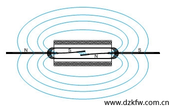 圖4、將干簧開關放置在線圈中心軸位置,磁場在這部份是最強的,兩干簧片呈相反極性,在兩簧片間產生足夠的吸力而互相接觸。