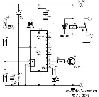 該干簧管傳感器電路的工作原理是:當磁鐵沒有靠近干簧管時,CD4017的輸出端0為高電平,LED指示燈亮,表示準備工作,輸出端1為低電平,三極管不導通,繼電器不吸合。一旦磁鐵靠近干簧管時,CD4017的14腳輸入一個高電平,輸出端0為低電平,1為高電平,LED滅,繼電器吸合。只有將磁鐵拿開,再次靠近干簧管,繼電器才會斷開。這個電路可以用在洗手間的門上,當人打開門進入洗手間時,磁鐵接觸到了干簧管,繼電器吸合,燈亮。當人從洗手間里出來時,磁鐵再次靠近干簧管,繼電器斷開,燈滅。