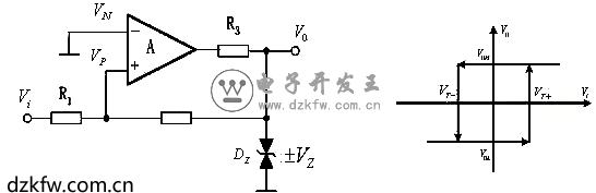 該比較器是一個具有遲滯回環傳輸特性的比較器。由于正反饋作用,這種比較器的門限電壓是隨輸出電壓V0的變化而變化。在實際電路中為了滿足負載的需要,通常在集成運放的輸出端加穩壓管限幅電路,從而獲得合適的Voh和Vol。遲滯比較器的電路圖如下圖所示。