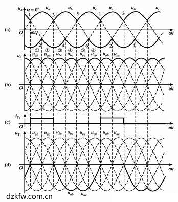 在電感性負載下每個晶閘管各導通1/3周期(120°),共陰極與共陽極組同相元件導通時間上互差半個周期(180°),使得三相整流電路中的晶閘管將按1→2→3→4→5→6的順序導通,且兩相鄰序號晶閘管的導通時間上互差60°。這樣一個導通的順序也就是各元件上門極觸發脈沖的順序,觸發電路必須按此順序依次將觸發信號施加到對應晶閘管門極之上。