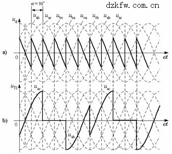 α>60°后,線電壓瞬時值將過零變負,此時由于流過負載電感Ld中的電流有減小趨勢,使得Ld上感應出順晶閘管單向導電方向的自感電勢eL,這樣作用在導通晶閘管對上的陽極電壓為(u2L+eL)。由于負載電感足夠大,使得在下一對晶閘管觸發導通之前能保證(u2L+eL)>0,盡管線電壓過零變負,仍能保證原導通的晶閘管對繼續導通,直流電壓ud中出現了負電壓波形。圖5為α = 90°時的ud與uT1電壓波形。