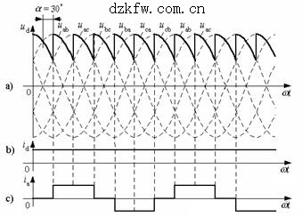 圖3為α=30°時的整流電路電壓波形,其中直流電壓ud波形可以直接從線電壓u<?XML:NAMESPACE PREFIX = ST1 />2l波形上分析求得。圖3還給出了負載電流id、晶閘管VT1上電流iT1及變壓器副邊a相電流ia的波形。