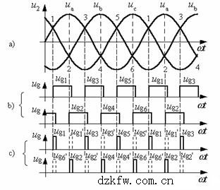 有兩種脈沖形式可以達到這一要求:一種是采用寬度大于60°而小于120°的寬脈沖觸發,如圖6b)所;另一種方法是在觸發某一號晶閘管時,同時給前一號晶閘管補發一脈沖。如圖6