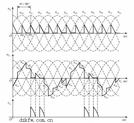 圖8給出了α=90°時的電壓波形、晶閘管VT1的電流iT1及電壓uT1波形。