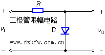 一種簡(jiǎn)單的限幅電路如圖所示。當(dāng)vI小于二極管導(dǎo)通電壓時(shí),二極管不導(dǎo)通,vO » vI;當(dāng)vI超過(guò)二極管的導(dǎo)通電壓vD,二極管導(dǎo)通,其兩端電壓就是vD。由于二極管正向?qū)ê螅鋬啥穗妷鹤兓苄。援?dāng)vI有很大變化時(shí),vO的值卻被限制在一定范圍內(nèi)。這種電路可用來(lái)減少某些信號(hào)的幅值,以適應(yīng)不同的要求或保護(hù)電路中的元器件。