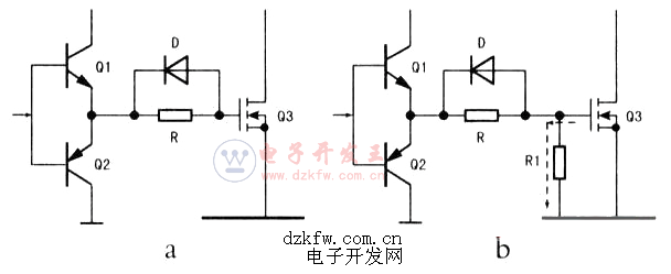 看一個具體的例子:MOS管在開關狀態(tài)工作時,Q1、Q2是輪流導通,MOS管柵極在反復充、放電狀態(tài),如果在此時關閉電源,MOS管的柵極就有兩種狀態(tài):一種是放電狀態(tài),柵極等效電容沒有電荷存儲;另一個是充電狀態(tài),柵極等效電容正好處于電荷充滿狀態(tài),如下圖a所示。雖然電源切斷,此時Q1、Q2也都處于斷開狀態(tài),電荷沒有釋放的回路,但MOS管柵極的電場仍然存在(能保持很長時間),建立導電溝道的條件并沒有消失。這樣在再次開機瞬間,由于激勵信號還沒有建立,而開機瞬間MOS管的漏極電源(V1)隨機提供,在導電溝道的作用下,MOS管立刻產生不受控的巨大漏極電流Id,引起MOS管燒壞。為了避免此現象產生,在MOS管的柵極對源極并接一只泄放電阻R1,如下圖b所示,關機后柵極存儲的電荷通過R1迅速釋放,此電阻的阻值不可太大,以保證電荷的迅速釋放,一般在五千歐至數十千歐左右。