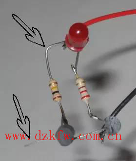 LED、 220歐姆電阻、晶體管的連接如照片中顯示。手指觸摸圖中的兩個(gè)點(diǎn)可以點(diǎn)亮LED。由于一只晶體管的放大倍數(shù)有限,想讓LED發(fā)光更明亮,或許你需要用點(diǎn)力兩只手分別捏住兩個(gè)點(diǎn)。你的身體相當(dāng)于一個(gè)電阻,電流流過(guò)你的身體(手指)給三極管基極提供一個(gè)偏置電流。晶體管將流過(guò)你手指的電流放大約200倍,這足以點(diǎn)亮LED。