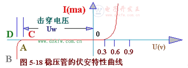 穩壓管的穩壓特性,可用圖5一18所示伏安特性曲線很清楚地表示出來。