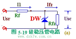由硅穩壓管組成的簡單穩壓電路如圖5- l9(a)所示。硅穩壓管DW與負載Rfz,并聯,R1為限流電阻。