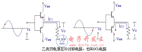 乙類雙電源互補對稱電路,也叫OCL電路。如下圖,兩晶體管分別為NPN管和PNP管,由于它們的特性相近,故稱為互補對稱管。靜態時,兩管的ICQ=0;有輸入信號時,兩管輪流導通,NPN在正半周導通(左圖),PNP在負半周導通(右圖),從而相互補充,使得始終有電流流過負載。既避免了輸出波形的嚴重失真,又提高了電路的效率。由于兩管互補對方的不足,工作性能對稱, 所以這種電路通常稱為互補對稱電路。