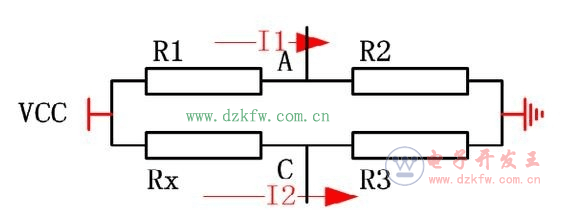 假設(shè)流過(guò)R1,R2橋臂的電流為I1,流過(guò)R3,Rx橋臂的電流為I2,電橋供電電壓為VCC,如下圖所示。