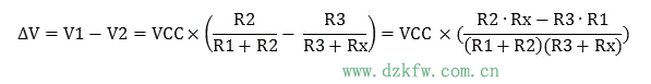 如果4個(gè)電阻都相等,即R1=R2=R3=Rx,那么ΔV=0,即電橋處于平衡狀態(tài);