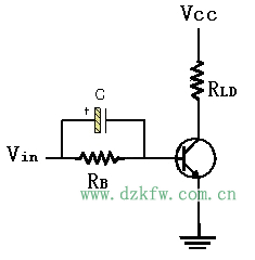 在一些對三極管開關電路動作速度要求較高的環(huán)境,例如通訊領域,要求開關電路需要具備快速切換動作的特性,因此我們也就必須采取相應的改良措施,以加快三極管開關的切換速度。下圖中,圖1為一種常見的切換速度改良方式,此方法只須在RB電阻上并聯(lián)一只加速電容器。因此,當Vin由零電壓往上升并開始送電流至基極時,電容器由于無法瞬間充電,故形同短路,然而此時卻有瞬間的大電流由電容器流向基極,因此也就加快了開關導通的速度。稍后待充電完畢后,電容就形同開路,同時,這樣做還不會影響三極管的正常工作。