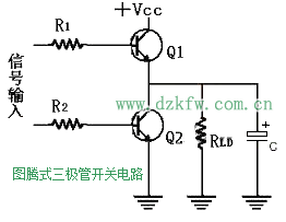 在上圖圖3所提供的圖騰式三極管開關電路中,我們可以看到,該電路系統(tǒng)左半部的輸入控制電路,負責Q1和Q2三極管的導通與截斷控制,但是必須確保Q1和Q2使不致同時導通,否則將使VCC和地之間經(jīng)由Q1和Q2而形同短路,果真如此,則短路的大電流至少將使一只三極管燒毀。因此圖騰式三極管開關絕對不能采用并聯(lián)方式來使用,否則只要圖騰上方的三極管Q1群中有任一只導通,而下方的Q2群中又恰好有一只導通,電源便經(jīng)由導通之Q1和Q2短路,而造成嚴重的后果。
