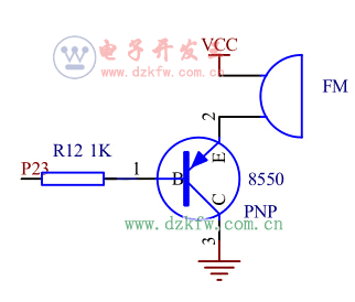 FM是一個蜂鳴器,8550是一個PNP型的三極管,C端接地,B端由單片機控制,E端通過FM接VCC。根據箭頭的方向,E端高電壓的時候,當B端也是高電壓,那么E和C之間是斷開的,當B端是低電壓,那么E和C直接導通,實現開關的作用。簡單的技巧:三極管上箭頭所在方向的二極管,只要二極管正向導通,那么三極管上下就能導通。
