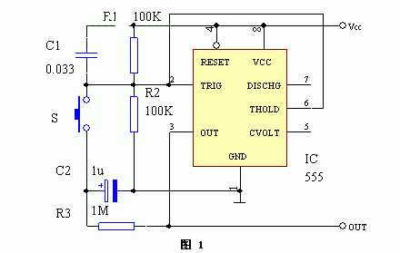 電路見圖1(點擊下載原理圖)。電路剛通電時,C1的存在使IC(555)⑥腳獲得一正脈沖,其③腳輸出低電平,此時C2上無電壓。按一下輕觸鍵S,C2上“0”電平作用于IC的②腳,③腳翻轉為高電平,通過R3對C2充電。S釋放后,C2充電到Vcc,而IC的②、⑥腳被R1、R2偏置于1/2Vcc,③腳高電平狀態保持不變。再按一下S,C2上電壓使IC⑥腳電壓大于2/3Vcc,③腳又翻轉為低電平。S釋放后,C2上電壓通過R3、IC③腳放電,②、⑥腳的電壓仍為1/2Vcc,③腳低電平的狀態可維持不變。由此可見,每按S一次,IC③腳高、低電平就變換一次。