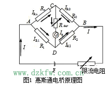 R1,R2是已知標準電阻;Rs是可變標準電阻;Rx是被測電阻B,D間接檢流計。接通電路后,檢流計一般不示零,說明B,D兩點電位不相等,通過調(diào)節(jié)Rs,使檢流計中無電流通過(IK=0),此時電達到平衡。