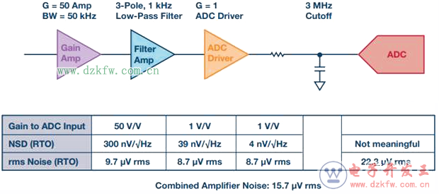 將多個(gè)噪聲源的噪聲頻譜密度(nV/√Hz)加總(電壓噪聲源按平方和開根號(hào)),而不分別計(jì)算各噪聲源的rms噪聲,可以節(jié)省時(shí)間,但這種簡化僅適用于各噪聲源看到的帶寬相同的情況。如果各噪聲源看到的帶寬不同,簡單加總就變成一個(gè)可怕的陷阱。圖1顯示了過采樣系統(tǒng)中的情況。從噪聲頻譜密度看,系統(tǒng)總噪聲似乎以增益放大器為主,但一旦考慮帶寬,各級(jí)貢獻(xiàn)的rms噪聲其實(shí)非常相近。