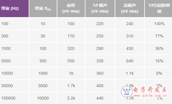 表1. 1/f噪聲影響與電路帶寬的關(guān)系示例