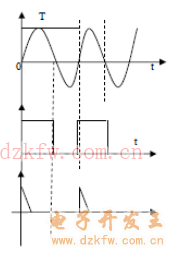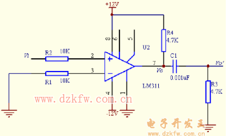 當輸入信號Vi為一正弦波時,Vi每過零一次,比較器的輸出Vo將產生一次電壓跳變,輸入Vi,輸出Vo,經RC微分電路后的輸出Vo’如下圖所示: