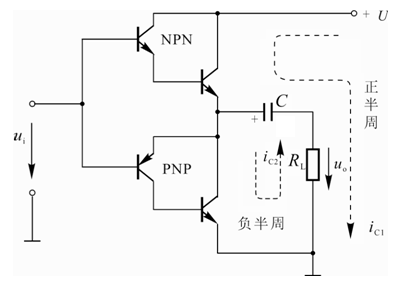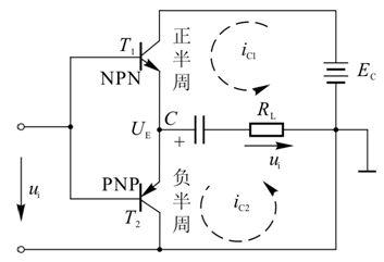 在輸入信號的正半周,T1導(dǎo)通、T2截止、由電源EC提供的集電極電流iC1正向流過負(fù)載RL;在輸入信號的負(fù)半周,T1截止,T2導(dǎo)通,此時代替電源的電容器C通過導(dǎo)通的T2放電,集電極電流iC2反向流過負(fù)載RL。