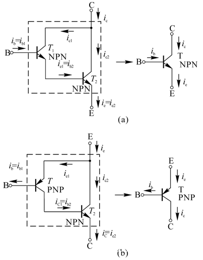 其次,從圖6-34(b)可以看出,復(fù)合管的類型與第一個晶體管T1相同,而與后接晶體管T2的類型無關(guān)。