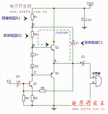 自舉過程分析:當(dāng)靜態(tài)時,VCC經(jīng)R1給對C1充電,使C1產(chǎn)生上正下負(fù)的電壓U1,那么 E點(diǎn)的電壓Ue就是U1和A點(diǎn)電壓Ua之和。由于電容C1電量大,放電時間長,短時間內(nèi)U1能保持不變。當(dāng)Q2正半周大信號來臨時,Ua電壓升高導(dǎo)致Ue電壓升高。而當(dāng)幅度很大時,Ua值接近VCC,Ue電壓將會超過VCC。當(dāng)Ue>vcc時,E點(diǎn)會有電流流向VCC,而如果將R1電路,E點(diǎn)最多只有是VCC,所以有了自舉電阻R1后,自舉效果會更好。升壓過的Ue經(jīng)R2加到Q2基極上,使電壓Ub變大,基極電流變大,Q2發(fā)射極輸出信號電流變大,彌補(bǔ)因Q2集電極與發(fā)射極之間直流電壓下降而造成的輸出電流不足,這一過程稱為自舉。